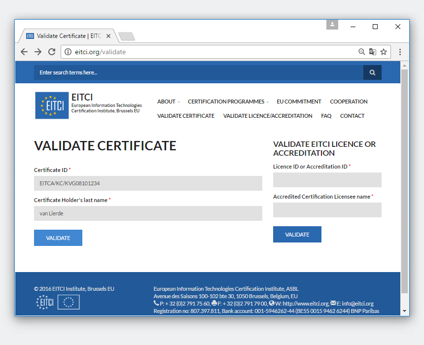 Процедуры сертификации Академии EITCA и EITC приводят не только к выдаче надлежащим образом защищенных цифровых сертификатов (в случае Академии EITCA, сопровождаемой подробными приложениями к сертификации и всеми соответствующими сертификатами EITC, а также в случае сертификатов EITC, содержащих подробное описание программы в рамках самого Сертификата), но также с предоставлением соответствующих услуг по валидации. Цифровые сертификаты EITC/EITCA следует понимать как их уникальные идентификационные номера, которые после ввода вместе с защитой личных данных в систему подтверждения сертификации Института EITCI позволяют проводить онлайн-проверку имеющихся сертификатов, а также подробную информацию о масштабах программ, заполненных владельцем сертификата, а также распечатка соответствующих готовых к печати версий сертификатов и приложений. Сертификаты EITC (полученные по отдельности или в рамках программы Академии EITCA) разработаны с использованием идентификационных визуальных меток (QR-кодов), которые обеспечивают автоматическое распознавание машины и проверку сертификации с помощью приложений визуального сканирования меток.