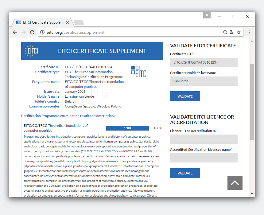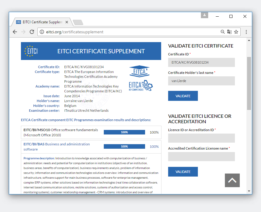 Процедуры сертификации Академии EITCA и EITC приводят не только к выдаче должным образом защищенных цифровых сертификатов (в случае Академии EITCA, сопровождаемой подробными сертификационными приложениями и всеми соответствующими замещающими сертификатами EITC, а также в случае сертификатов EITC, содержащих подробное описание в сам Сертификат), но также с предоставлением соответствующих услуг электронной проверки. Цифровые сертификаты EITC/EITCA следует понимать как их уникальные идентификационные номера, которые при вводе с надлежащим образом защищенными данными в систему подтверждения сертификации Института EITCI позволяют проводить онлайн-проверку сертификатов вместе с подробной информацией о объеме программы, заполненной владельцем сертификата, а также а также загрузка или распечатка соответствующих подтверждений и дополнений. Сертификаты EITC (полученные по отдельности или как часть сертификата Академии EITCA) разработаны с использованием идентификатора, несущего QR-коды, которые обеспечивают автоматическое распознавание и проверку устройства с помощью приложений QR-сканирования на телефонной камере.