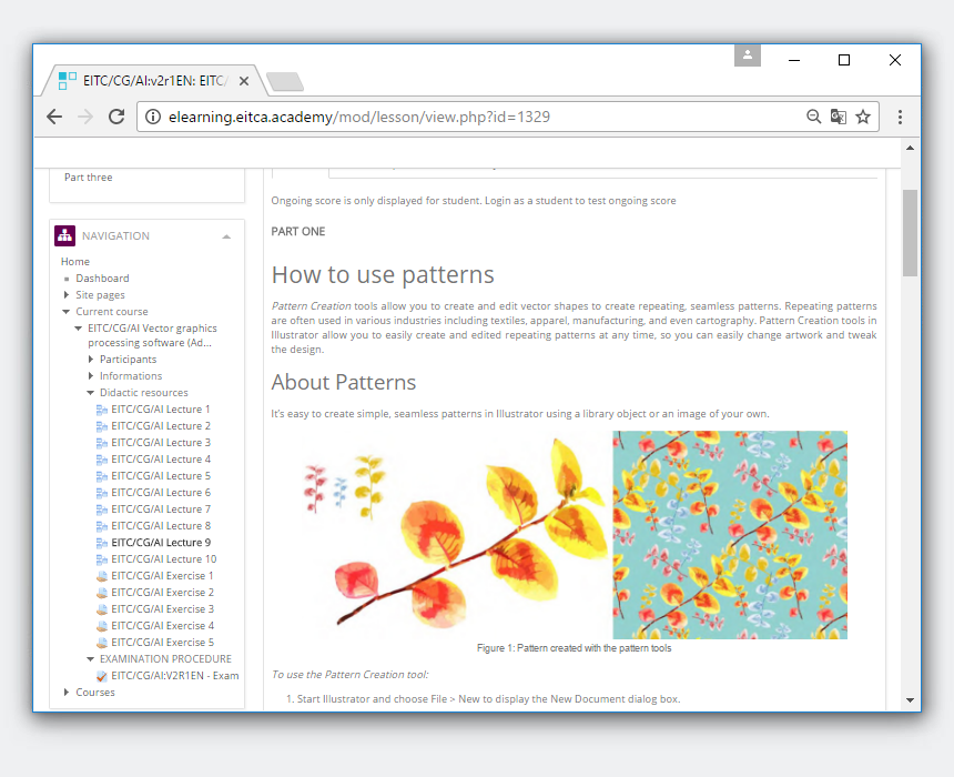 Участник имеет индивидуальный неограниченный доступ к платформе сертификации, обеспечивающей хорошо спланированный пошаговый дидактический процесс, контролируемый персоналом, ответственным за выполнение программы в соответствии с рекомендациями Института EITCI, с электронными материалами (в том числе открытый доступ): лекции (в мультимедийной и текстовой форме вместе с иллюстрациями, анимацией, фотографиями или видео, на которые ссылаются и которые доступны непосредственно с платформы) с добавлением учебных пособий, лабораторий (включая образовательный пробный доступ к программному обеспечению, а также соответствующие интерактивные приложения) и неограниченные дистанционные дидактические консультации.