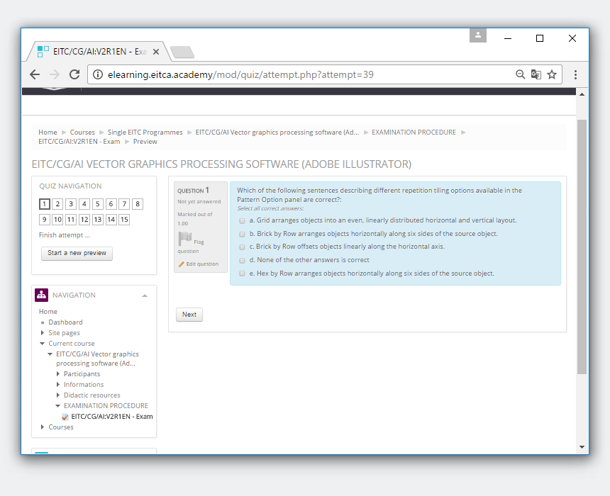 Этот удаленный тест проходит участник в рамках сертификационной платформы (где участник может пройти онлайн-интерактивный тест, который реализует случайный выбор тестовых вопросов, имея возможность вернуться к отвеченным или неотвеченным вопросам в течение 45 минут). Проходной балл экзамена EITC составляет 60% положительных ответов, но несоблюдение этого лимита позволяет участнику пересдать экзамен без дополнительных сборов (при каждой попытке экзамена доступна одна бесплатная пересдача для сдачи теста или улучшения проходного балла, после чего повторная сдача экзамена требует подачи заявления в администрацию, но остается без дополнительной платы). Завершение всех экзаменов EITC, которые составляют соответствующий сертификат Академии EITCA (с заменяющими программами EITC), также приводит к выдаче участнику соответствующего сертификата Академии EITCA (дополнительных экзаменов EITCA нет, и сертификаты EITCA выдаются на основе получения всех соответствующие сертификаты EITC, входящие в состав EITCA).