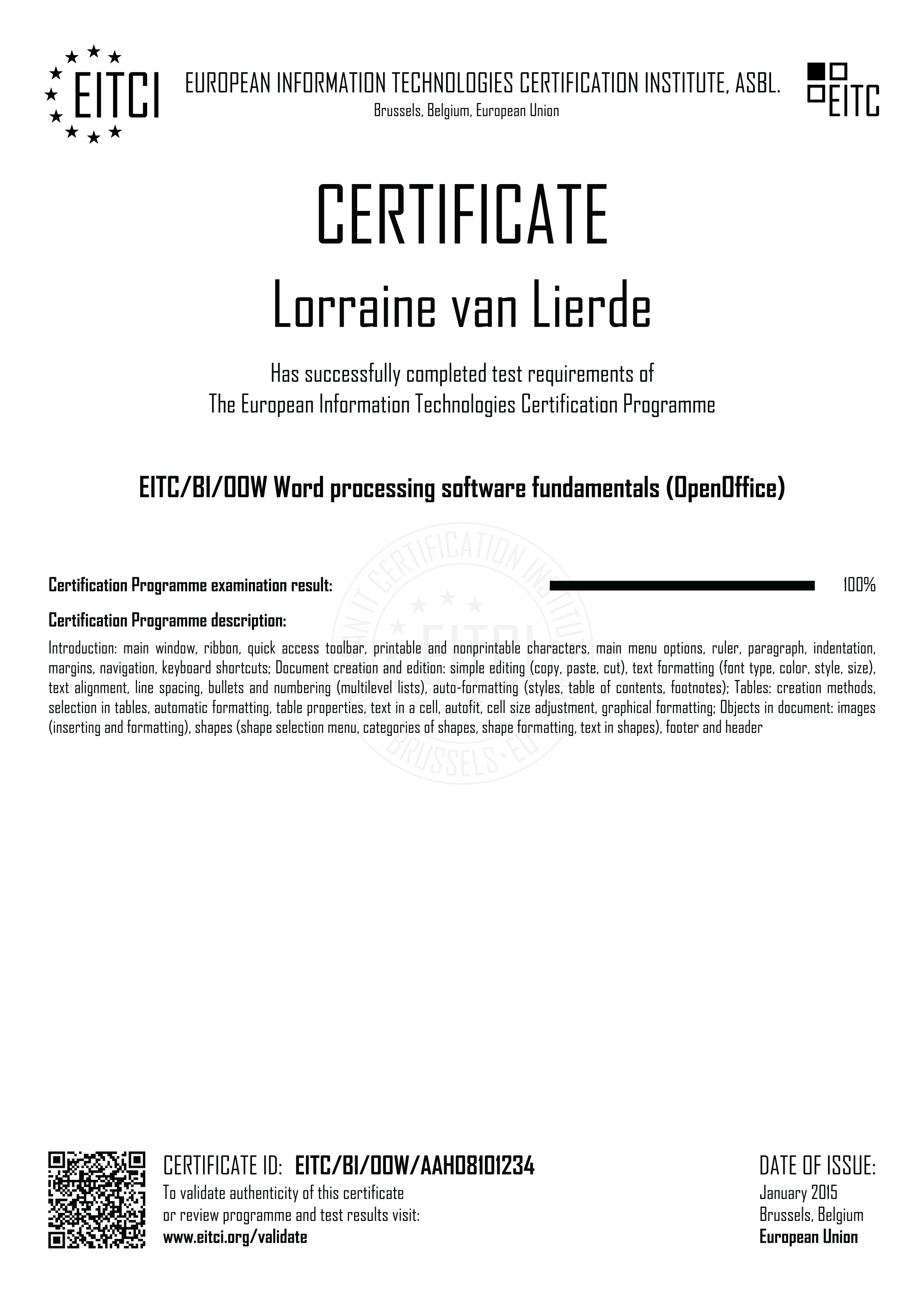 Записавшись на Европейскую сертификацию информационных технологий EITC/BI/OOW Основы программного обеспечения для обработки текстов (OpenOffice), вы получите доступ к полной дидактической программе, соответствующей учебной программе сертификации, и к соответствующей процедуре экзамена, выполненной полностью удаленно (с дополнительными повторными экзаменами, если требуется) , После успешного прохождения экзамена EITC/BI/OOW под вашим именем из Брюсселя будет выдано проверяемое персонализированное свидетельство EITC под руководством Европейского института сертификации информационных технологий EITCI, органа по аккредитации и сертификации программы. Для получения подробной информации о процедуре сертификации, пожалуйста, обратитесь к Как это работает .